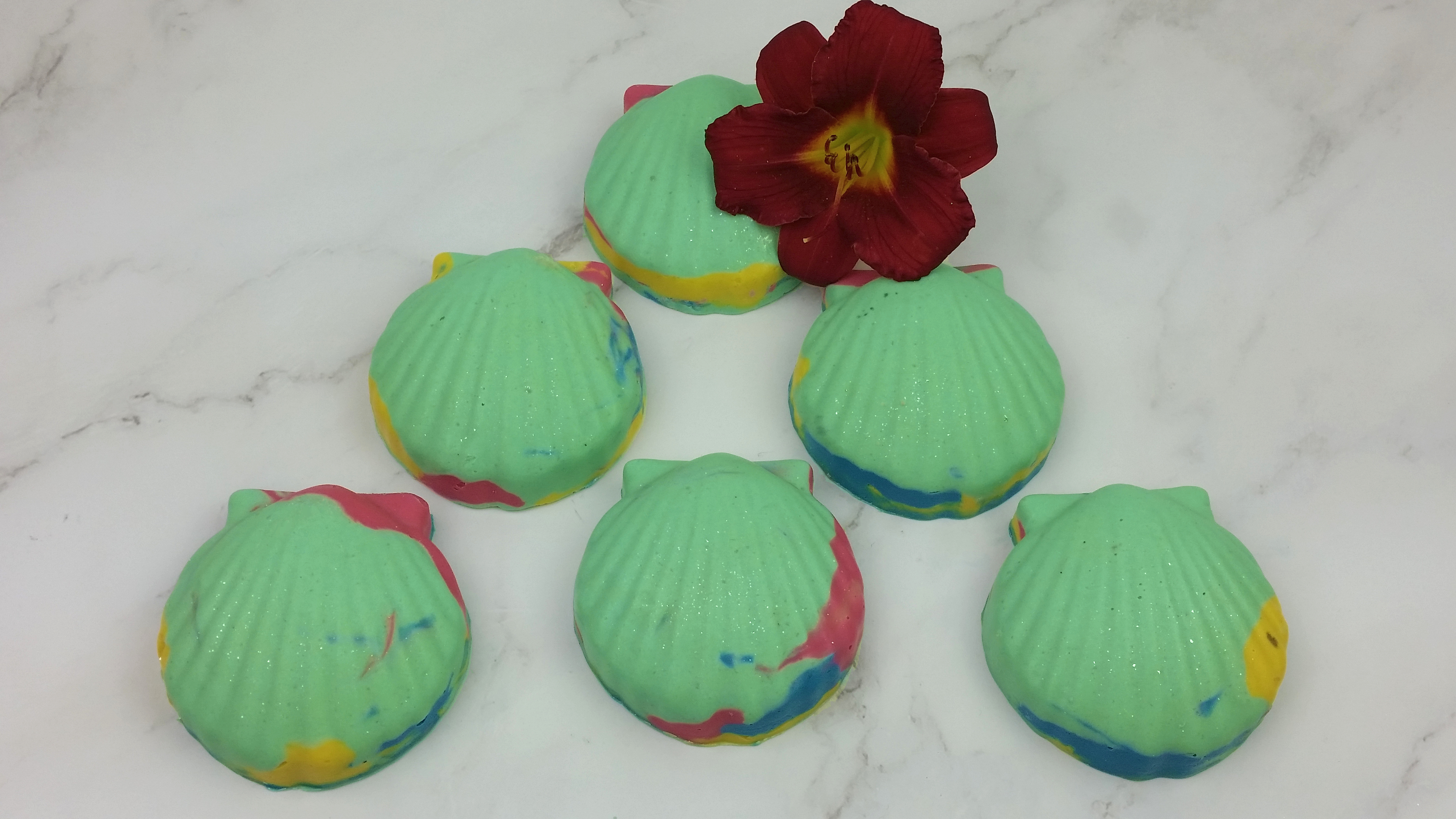 Ingredients: Olive Oil, Organic Coconut Oil, Organic Aloe Vera Juice, Organic Shea Butter, Food Grade Sodium Hydroxide, Sunflower Oil, Organic Coconut Milk, Phthalate-Free Fragrance Oil, Grapeseed Oil, Castor Oil, Organic Colloidal Oatmeal Powder, Kaolin Clay, Sea Salt, Mica, Bio-Glitter.
